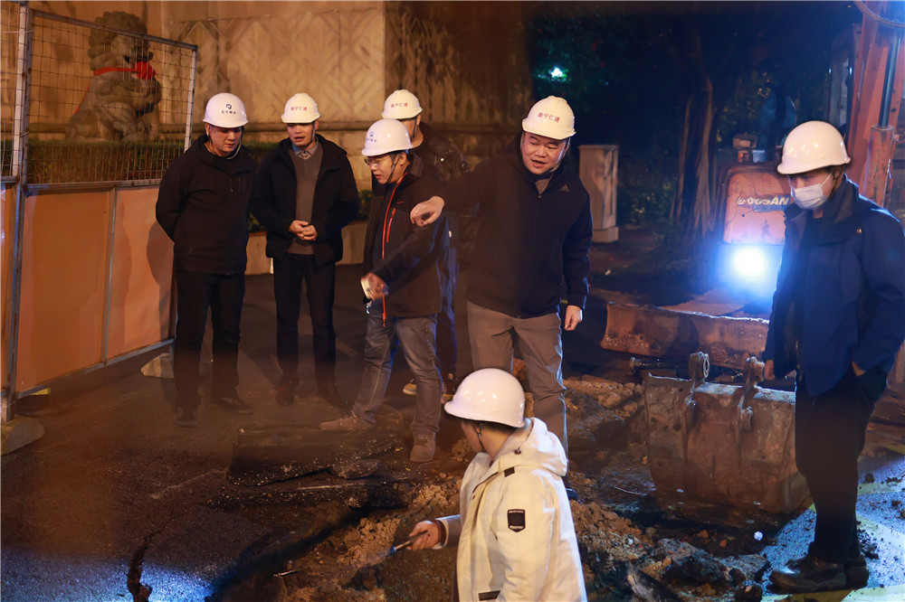 排水公司立即啟動(dòng)應(yīng)急預(yù)案,市住建局副局長(zhǎng)吳智、公司副總經(jīng)理程樂(lè)坐鎮(zhèn)指揮,運(yùn)維分公司經(jīng)理韋雄飛及有關(guān)負(fù)責(zé)人立即趕赴現(xiàn)場(chǎng)排查,核實(shí)為消防支隊(duì)用戶(hù)管破損,水流沖刷土體導(dǎo)致路面塌陷。當(dāng)天20時(shí),塌陷處完成圍擋,21時(shí)所有人員、車(chē)輛和設(shè)備全部到位,立即投入緊張地?fù)屝蕖?/p>