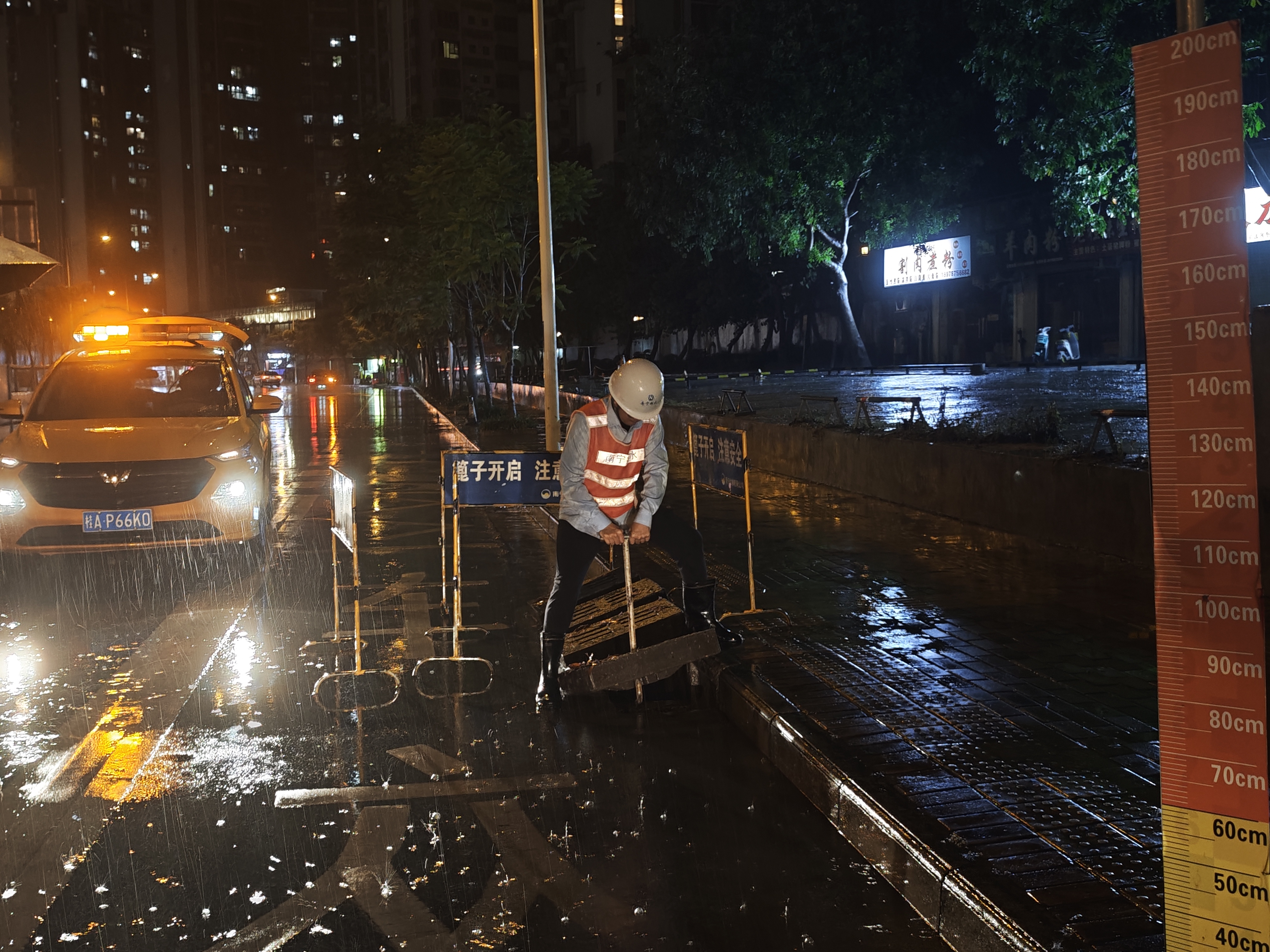 5月27日19時(shí),市排水公司運(yùn)維管理員梁煜華到達(dá)大淥嶺路口,擺放警示標(biāo)識(shí)、設(shè)置安全隔離帶、打開雨水箅子和井蓋,一套動(dòng)作行云流水。在確認(rèn)該處排水順暢后,他跟值守的工作人員打了聲招呼,又匆匆趕往鳳嶺北路楓林路口,查看積水處置情況,引導(dǎo)過往車輛有序通行。