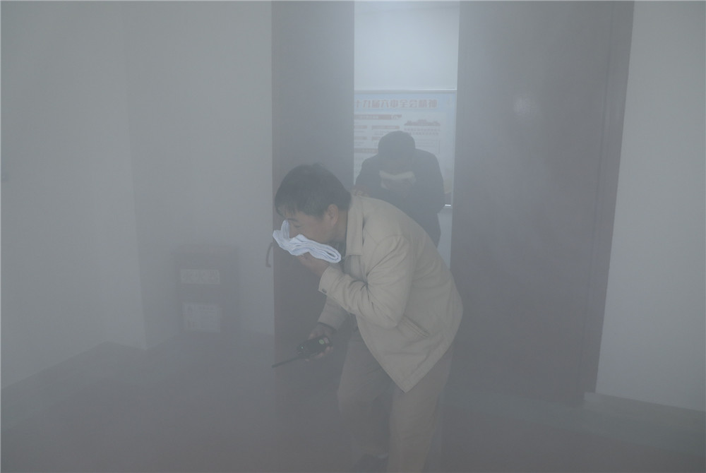 煙霧在樓層中彌漫開來,空氣里傳來濃烈刺鼻的氣味,在人工煙霧制造的“著火現(xiàn)場”背景下,大家按照緊急疏散的程序和要求,遵循“左手用毛巾捂住鼻子、嘴巴,右手扶著墻壁走”的規(guī)范姿勢,在安全疏導(dǎo)員的指揮下有條不紊地從安全通道撤離,各單位員工一個(gè)不少的有序集中在辦公大樓前的安全地帶。整個(gè)演練活動(dòng)達(dá)到了預(yù)期效果,取得了圓滿成功。